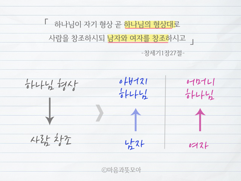 사람은 '우리'라는 하나님의 형상을 본따서 '우리'라는 하나님께서 창조하셨습니다. 그 결과 남자와 여자가 창조되었습니다. 이 말씀을 통해서 보건대 우리는 하나님의 형상에는 두 가지 형상이 존재한다는 중요한 사실을 발견할 수 있습니다. 즉 남성적 형상의 하나님과 여성적 형상의 하나님입니다. 남성적 형상의 하나님을 본따서 남자가 창조되었고, 여성적 형상의 하나님을 본따서 여자가 창조되었습니다.