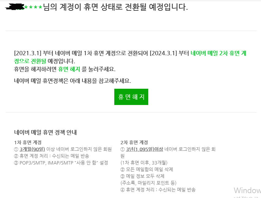 네이버 메일함을 열었는데 제 이메일이 휴면 상태로 전환될 예정이라는 메일이 한 통 와 있더라구요.