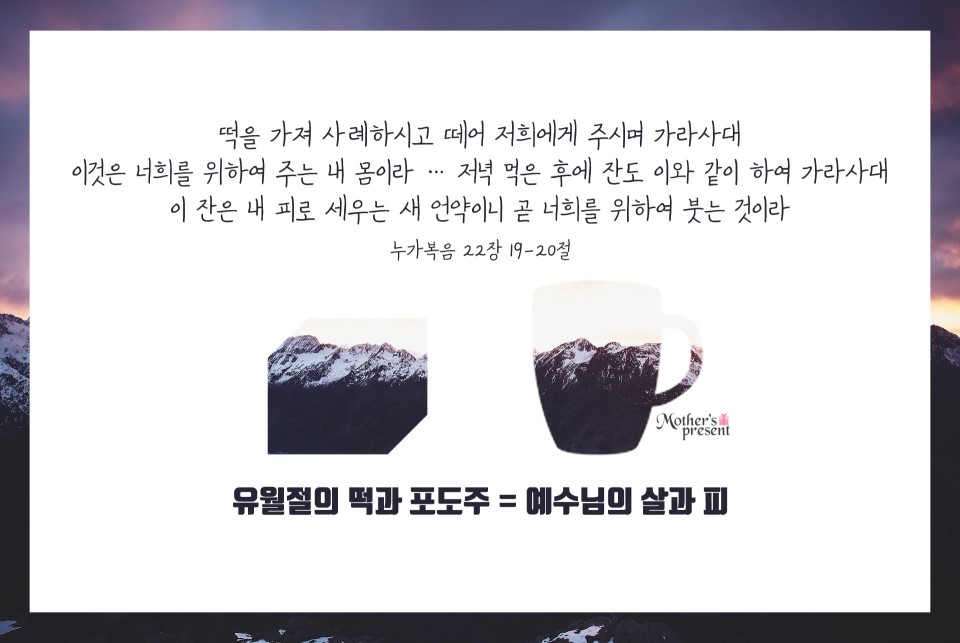 구약시대에는 유월절 양을 먹고 그 양의 피를 문설주에 바르는 방법으로 지켰으나 신약시대에는 지키는 방법을 바꾸어 주셨습니다. 왜냐하면 구약시대 유월절 양의 실체는 예수님이시기 때문에 이제는 예수님의 살과 피를 먹어야 합니다. 그런데 우리가 예수님의 살과 피를 먹고 마실 수가 없기에 유월절 떡과 포도주에 약속을 담아 주셨습니다.