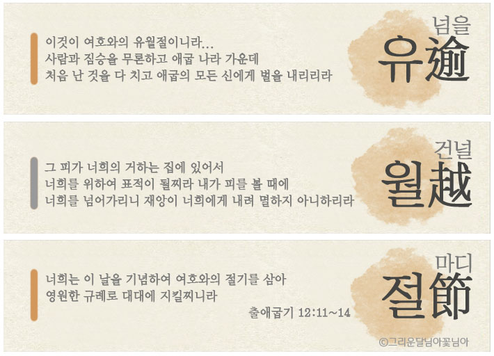 유월절은 넘을 유, 건널 월자를 써서 '재앙이 건너서 넘어간다'는 뜻이 담겨져 있습니다. 하나님께서는 유월절 어린양의 피를 볼 때에 재앙이 넘어갈 것이라 약속을 주시고 영원한 규례로 대대에 지키라고 명하셨습니다.