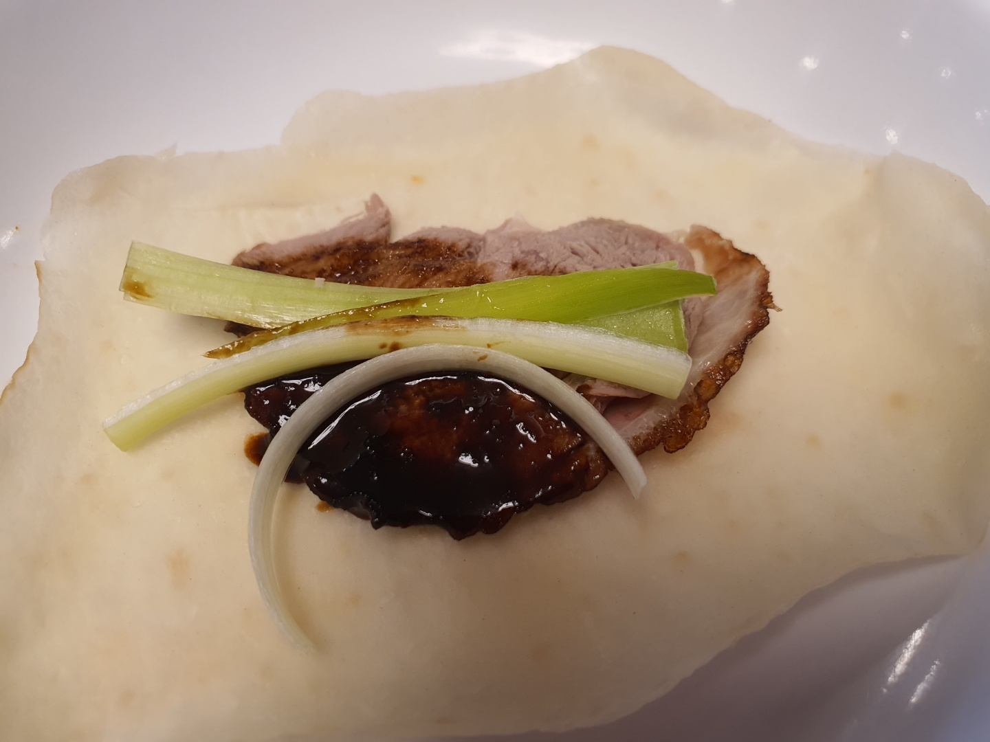먹는 방법은 오리고기를 춘장에 찍어 소스에 찍어서 밀병에 싸서 먹거나