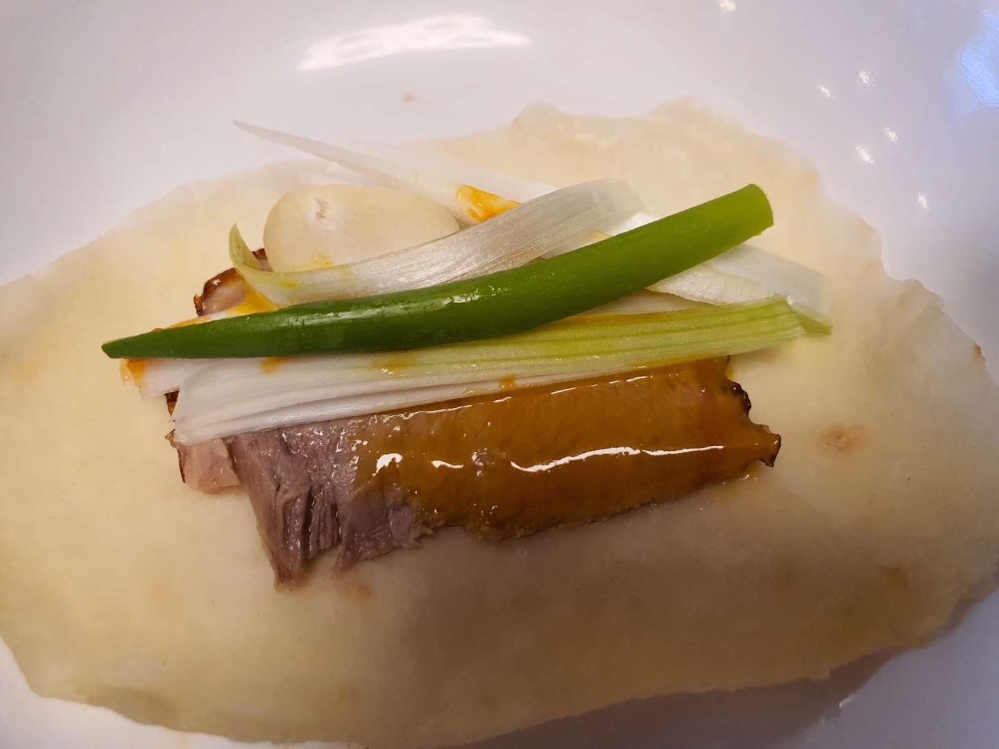 먹는 방법은 오리고기를 춘장에 찍어 소스에 찍어서 밀병에 싸서 먹거나