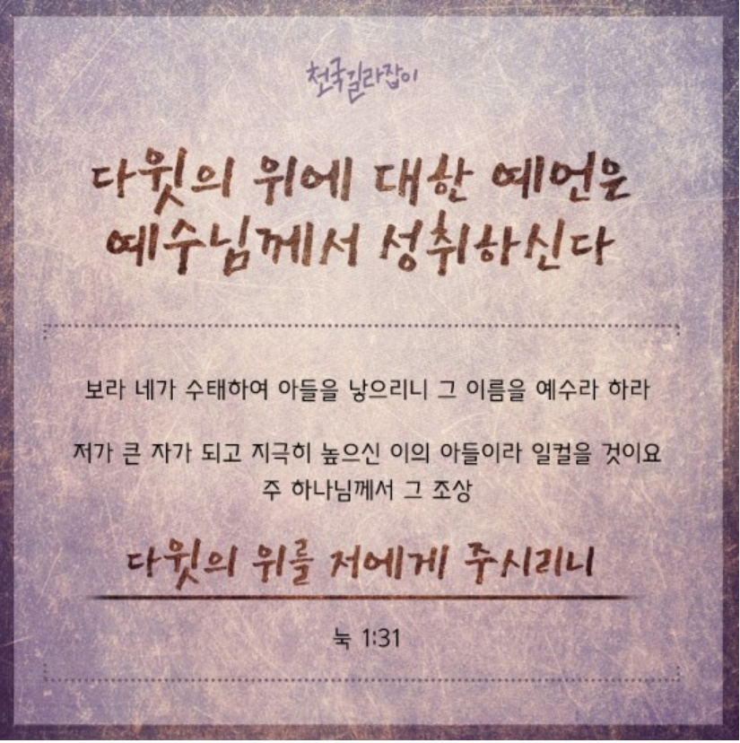 이 예언은 전능하시고 영존하시는 아버지 하나님께서 이 땅에 아기, 아들로 탄생하실 예언입니다. 하나님께서 이 땅에 육체로 오셔서 '다윗의 위'에 앉으신다고 하였습니다. '위'는 '자리 위(位)'자로 다윗의 앉은 자리는 '왕 위'지 않습니까. 즉 하나님께서 영적 다윗왕의 입장으로 오실 예언으로 이는 예수님을 통해 성취되었습니다.