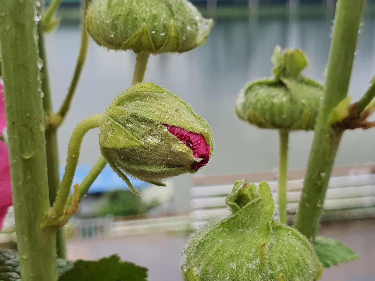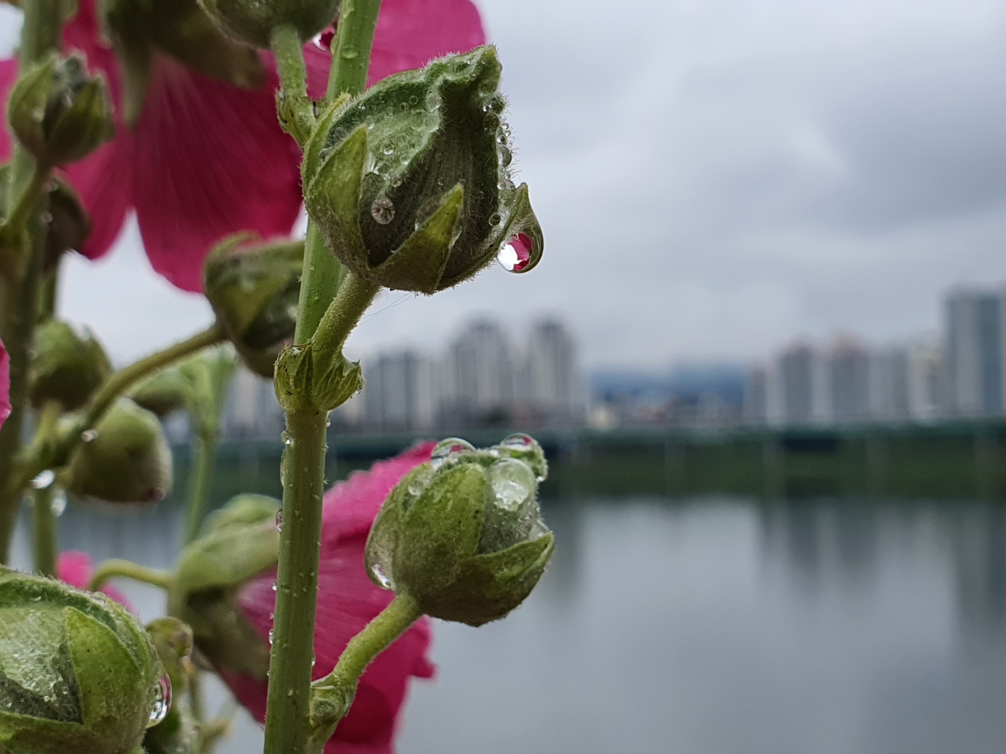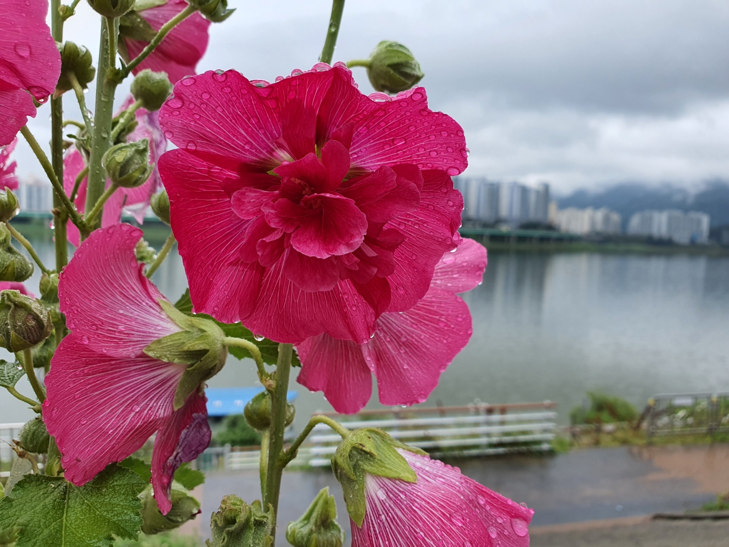 빗방울 머금은 겹접시꽃이 눈길을 사로잡네요.