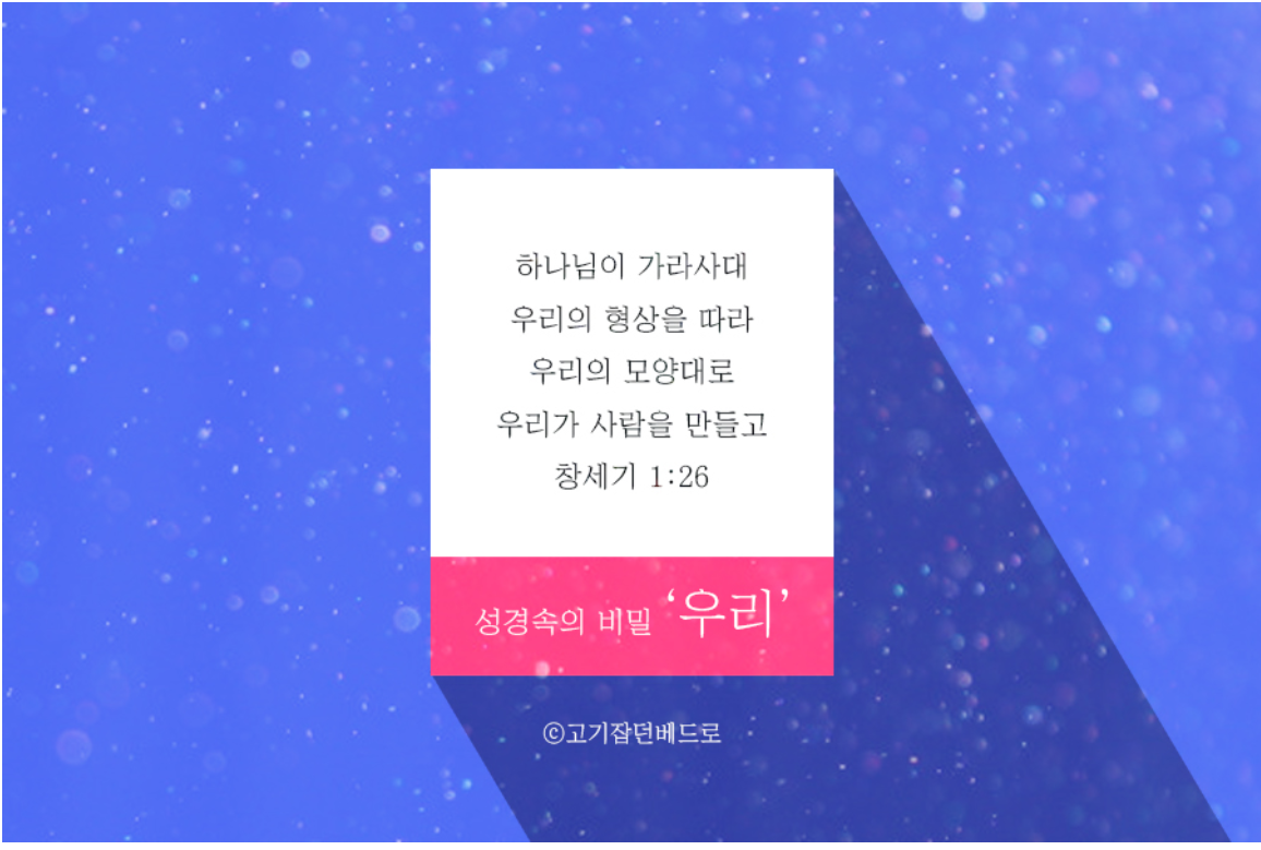 이 말씀은 하나님께서 사람을 창조하시는 장면입니다. 여기에서 하나님께서 당신을 가리켜 '우리'라고 하신 대목을 주의해서 봐야겠습니다. 하나님께서 만일  일반 기독교인들이 생각하는 것처럼 아버지 하나님 한 분만 존재하신다면 당연히 '나'라는 단수로 표현하셔야 할텐데 분명 '우리'라는 복수로 표현하셨습니다. 이는 오늘날 수많은 성경학자들이 미스테리로 꼽고 있는 부분입니다. 왜 '나'라는 단수로 표현하지 않으시고 '우리'라는 복수 즉 엘로힘 하나님으로 기록하셨을까요?그 해답은 이어지는 27절에서 얻을 수 있습니다.ㅣ