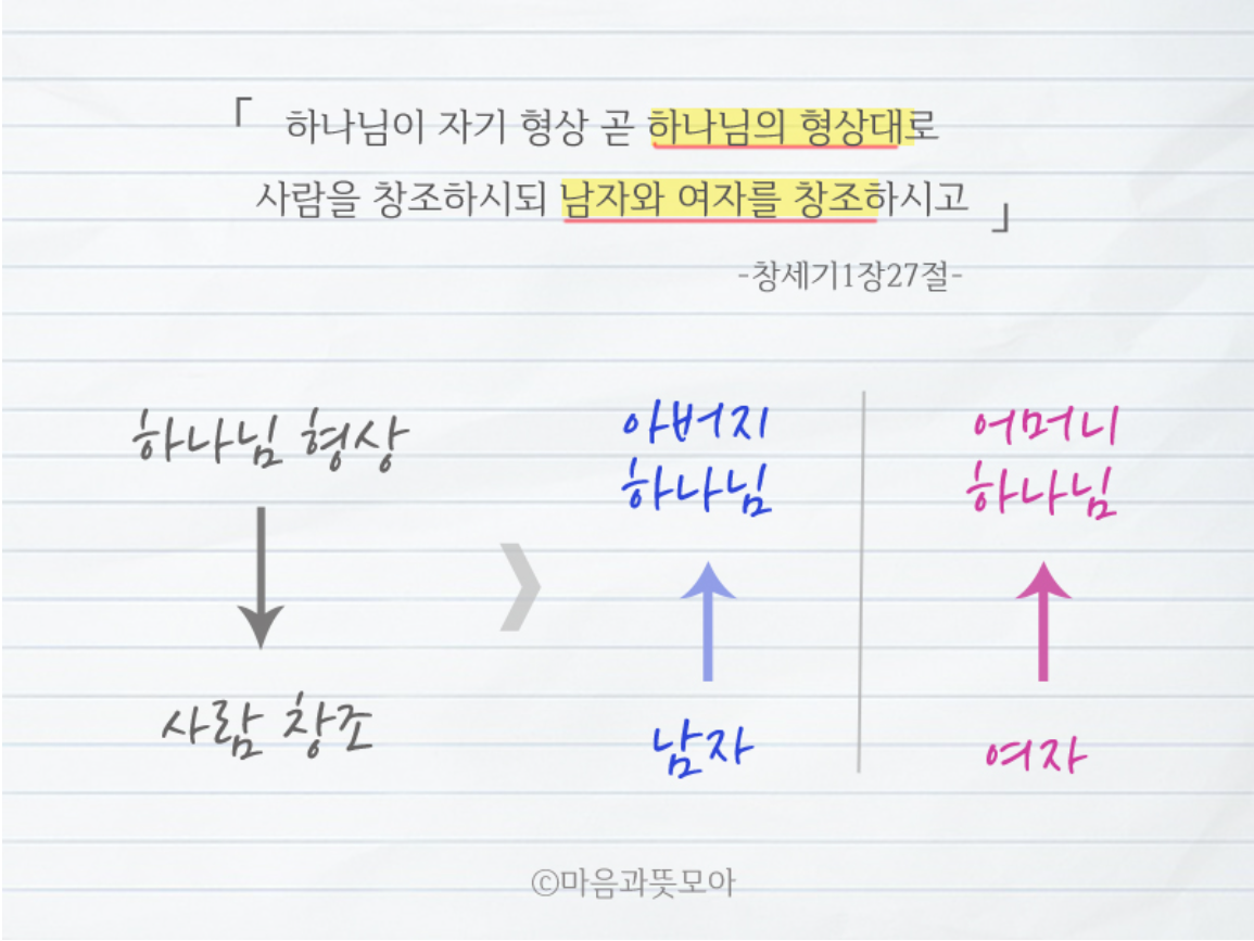 남성적 형상의 하나님을 오랫동안 누구라고 불러왔습니까. 아버지 하나님입니다. 그렇다면 여성적 형상의 하나님은 마땅히 누구라고 불러야겠습니까? 당연히 어머니 하나님 아니겠습니까. 아버지 하나님과 어머니 하나님께서 '우리'라고 하신 것입니다.