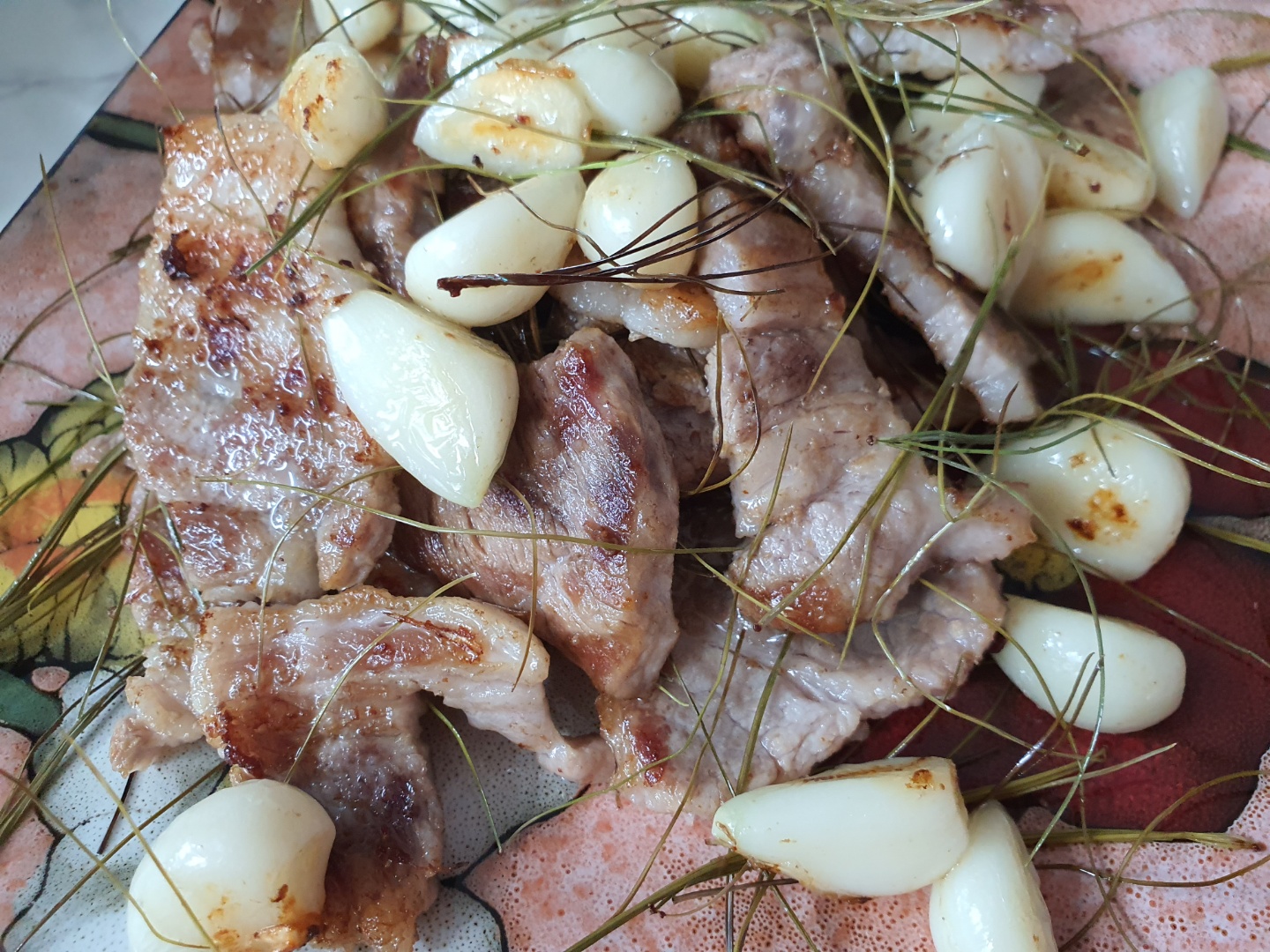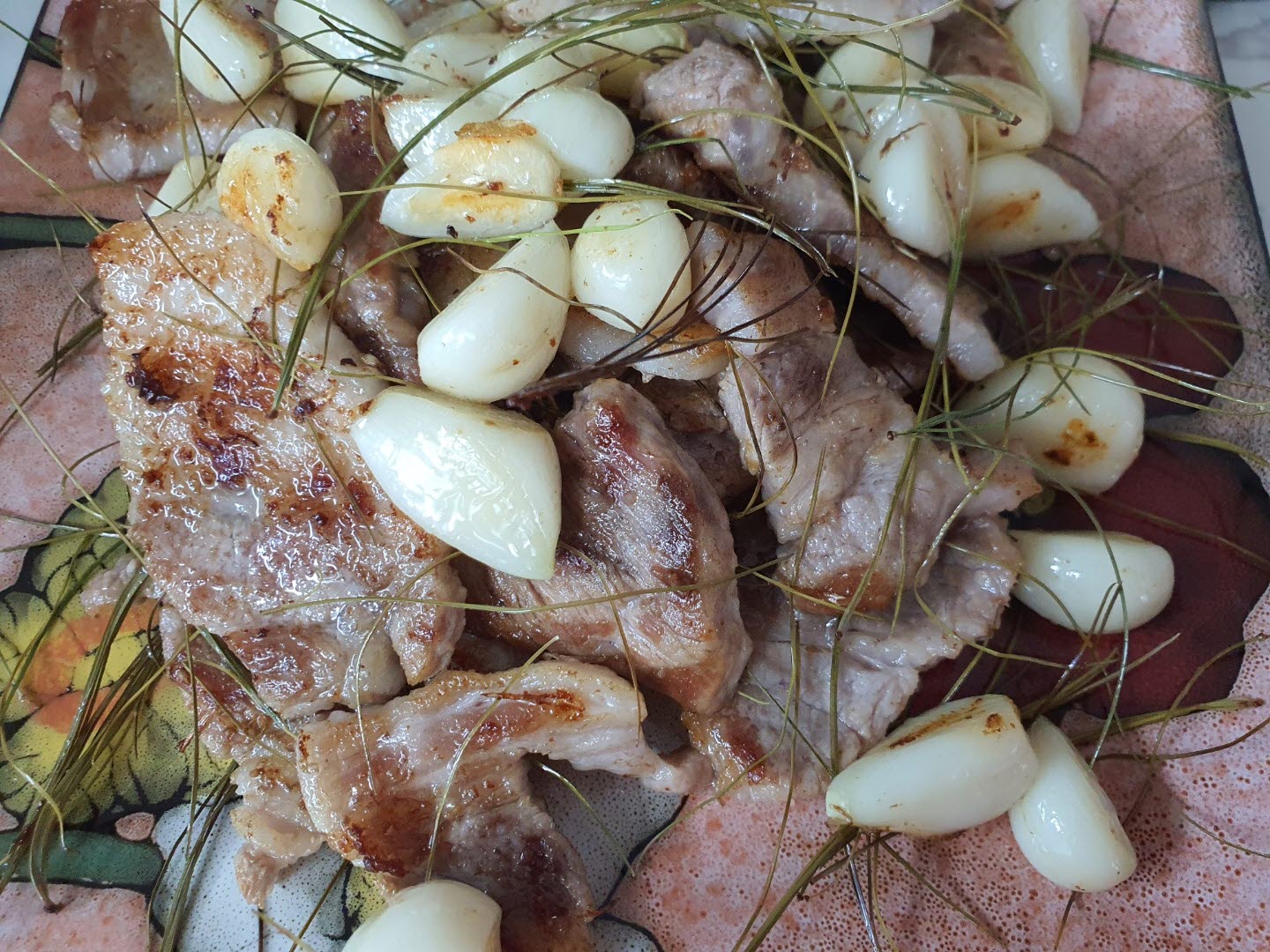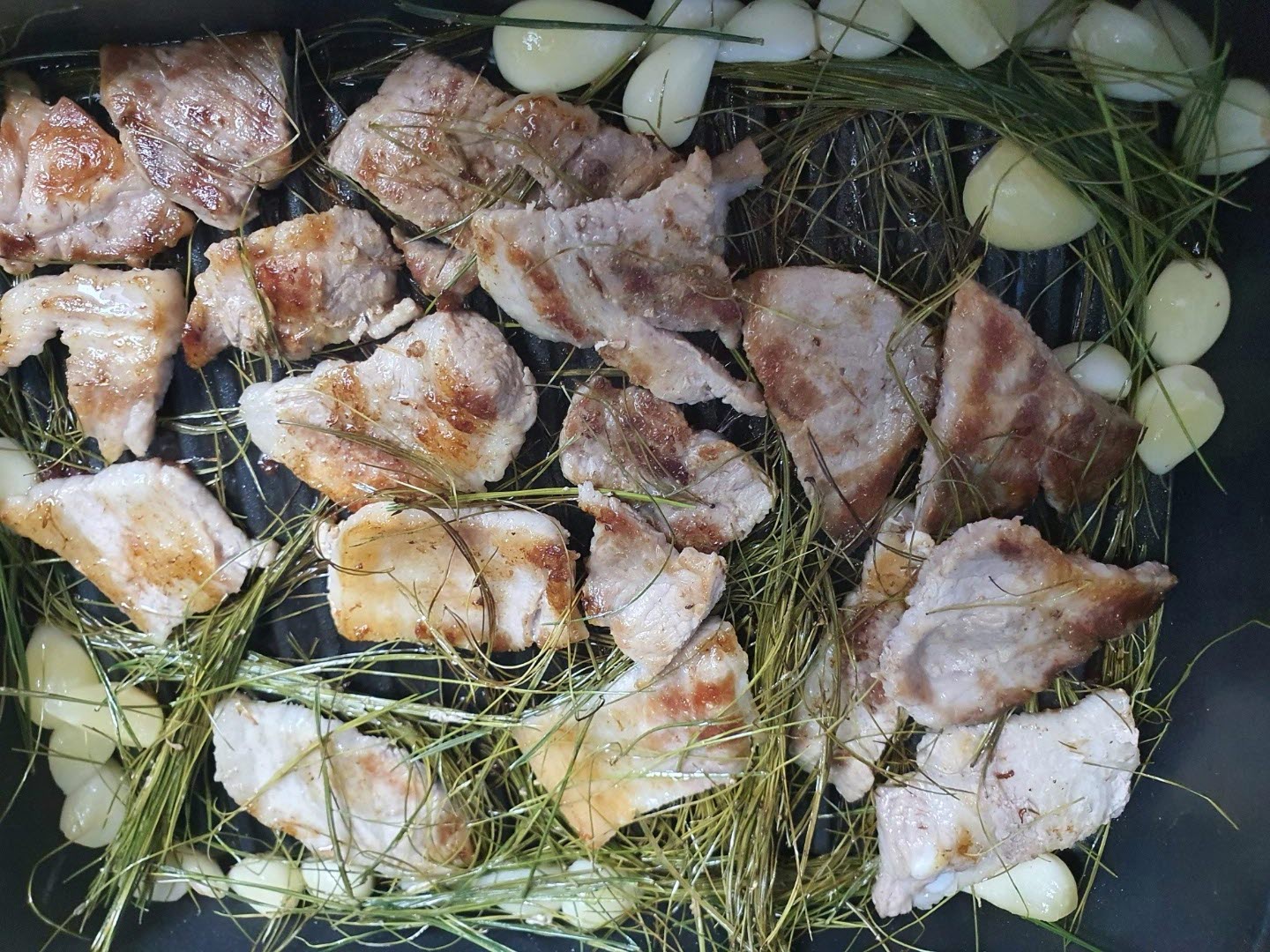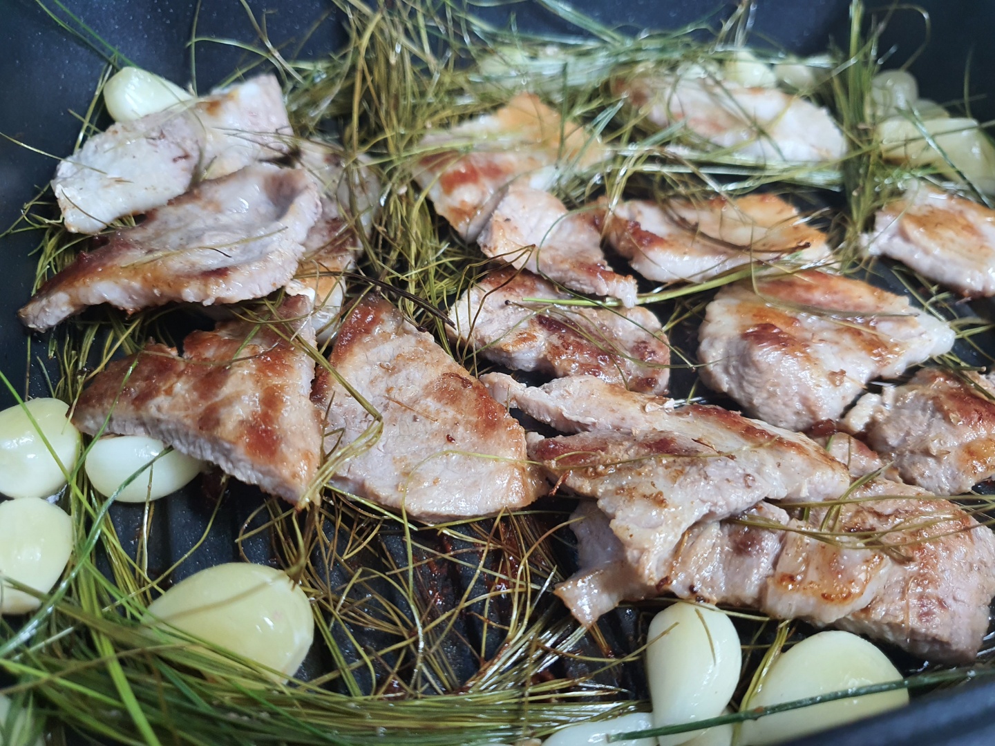 그리고 고기 불판에다 삼겹살, 목살, 씻은 솔잎, 마늘을 넣고 지글지글....
