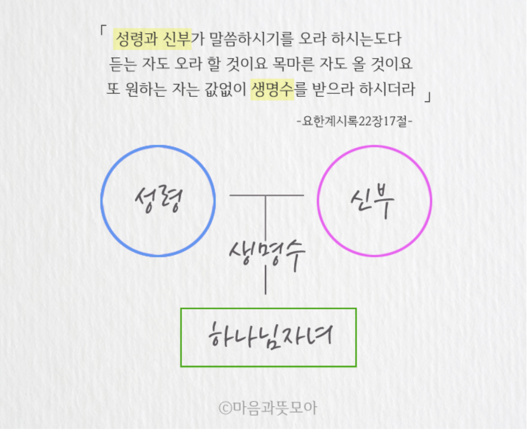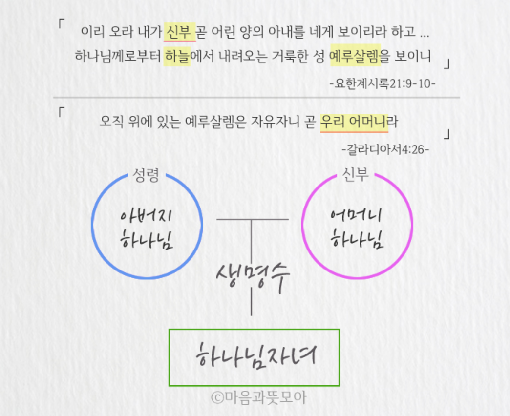 하나님의 자녀에게 생명수를 받으러 오라고 하시는 성령과 신부는 아버지 하나님과 어머니 하나님이십니다. 이 신부에 대해서 혹자는 '성도 혹은 교회'라고 주장을 하지만 상식적으로 성도가 어떻게 성도에게 생명수를 줄 수 있겠습니까.