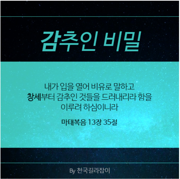 하나님의 비밀은 그리스도 곧 구원자이십니다. 하나님의 비밀이신 구원자를 깨닫기 위해서는 성경에 기록된 비유를 깨달아야 합니다. 그러나 우리 능력으로는 깨달을 수 없으니 하나님께서 친히 오시어 비유를 다 알려주셨습니다. 비유를 쓰신 분이 해석해주시지 않으시면 그 누가 알려줄 수 있겠습니까.
