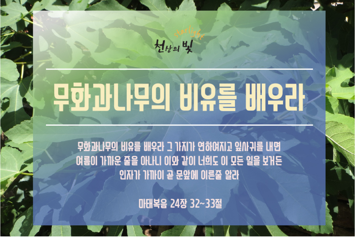 그렇다면 이 시대 누가 무화과나무의 비유를 배우고 깨달을 수 있을까요? 오직 천국의 비밀이 허락된 자들 뿐입니다. 아직도 무화과나무의 비유를 배우지 못했다면 구원에 대해 심각히 고민해야 할 문제입니다.