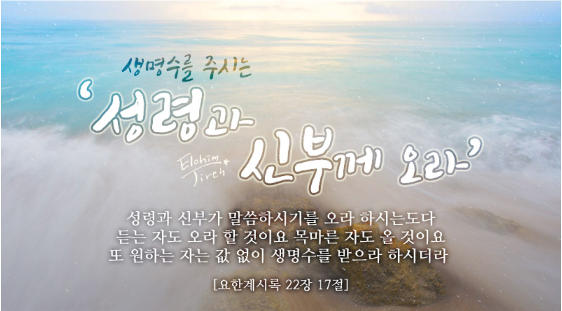 이 땅에 육체로 임하신 하나님의 마음은 오직 하나 !! 모든 인류인생들이 구원받는 것입니다. 그러하기에 지금 이 순간도 하나님께 나아오는 자들에게 값없이 생명수를 허락해 주십니다.