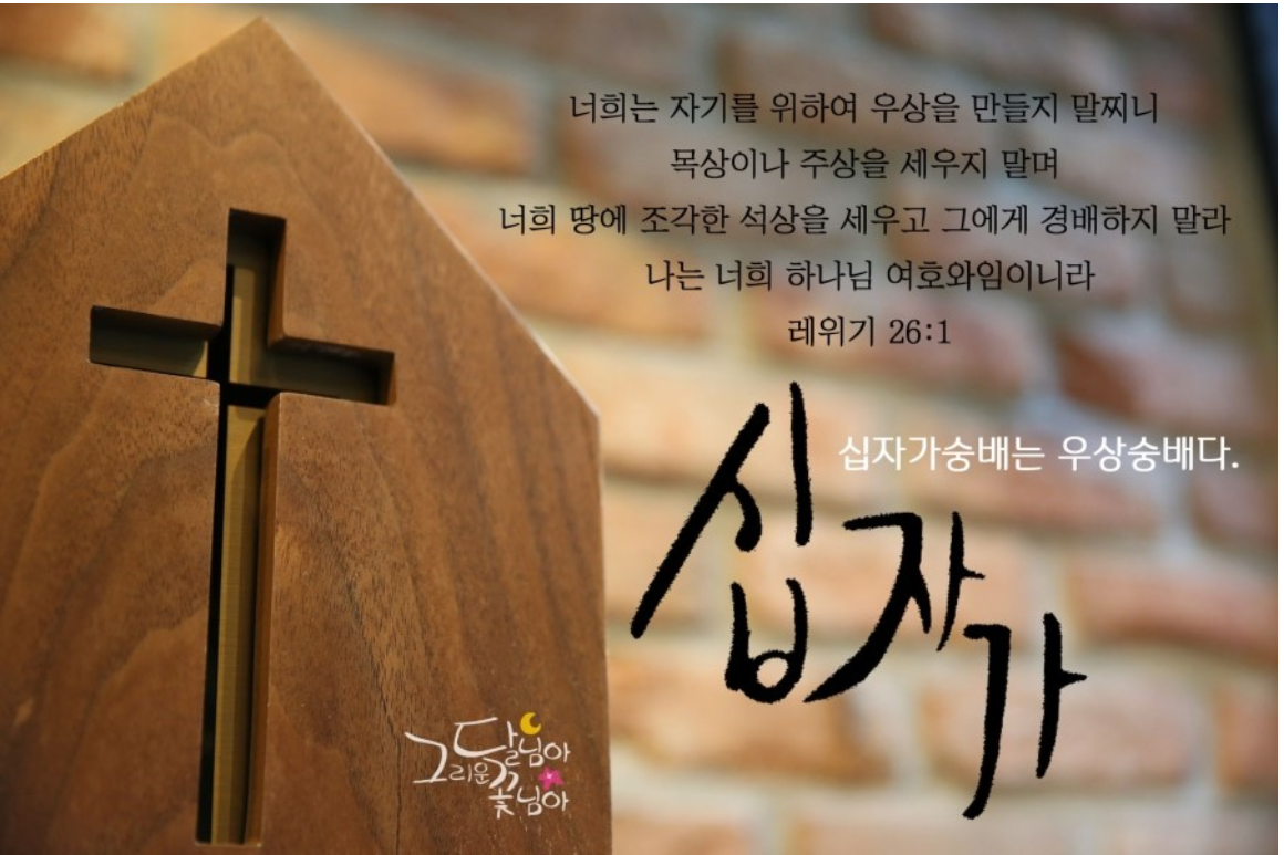 하나님께서는 우상을 만들지 말라고 경고하시며 목상, 주상, 석상을 세우고 경배하지 말라고 하셨습니다. 여기에서 목상은 나무로 만든 형상이고, 주상은 기둥 주(柱)자 이므로 기둥 모양의 형상을 뜻합니다. 석상은 잘 아시다시피 돌로 만든 형상입니다. 이처럼 나무나 돌같은 물질로 만들어서 섬기는 형상이 '우상'입니다. 그런데 오늘날 교회들을 보면 십자가를 나무로도 만들고 돌로도 만들고 금속으로도 만들어 세우고 있으니 하나님 보시기에 과연 어떠하실까요?