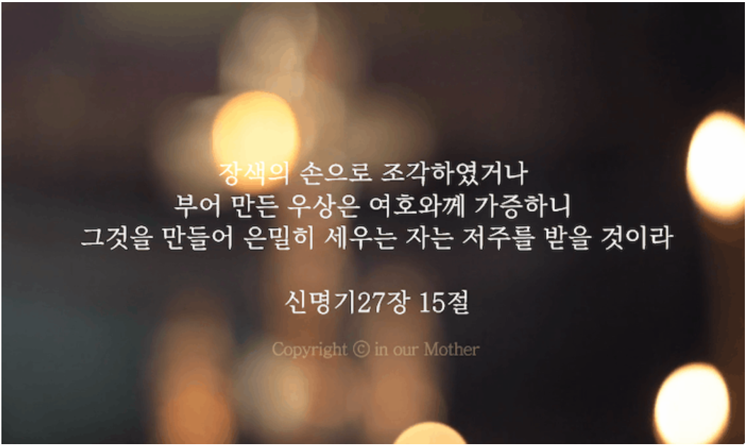 이것은 십계명의 두번째 계명입니다. 하나님을 섬김에 있어서 그 어떤 형상도 만들지 말고 절하지 말고 섬기지 말라는 것이 하나님의 뜻입니다. 여기에서 '아무 형상이든지'라는 말씀에 주목해야 합니다. 이 말씀은 그 어떤 형상도 예외가 없다는 말씀 아니겠습니까? '아무 형상이든지 만들지 말라'고 하셨기에 십자가만 예외가 될 수는 없습니다.