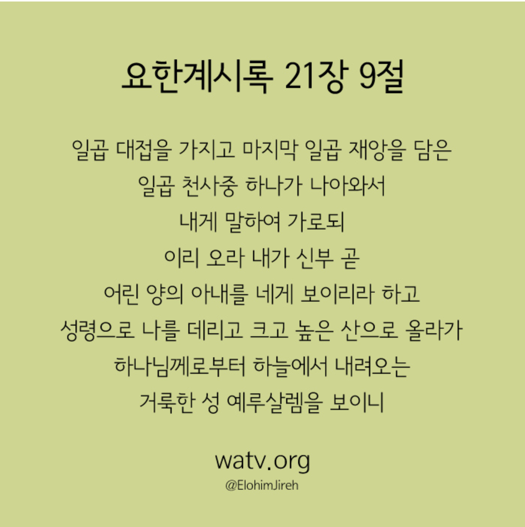 신부 곧 어린양의 아내이신 어머니 하나님의 청함을 받고 혼인잔치에 참여하여 복을 받으시겠습니까? 아직도 어머니 하나님을 부인하시겠습니까? 무조건 어머니 하나님을 부인하기에 급급하여 억지 주장만 펼칠 것이 아니라 과연 무엇이 참인지 잘 분별하여 어린양의 아내되신 하늘 예루살렘 어머니 하나님을 영접하셔서 구원받으시기 바랍니다. ^^