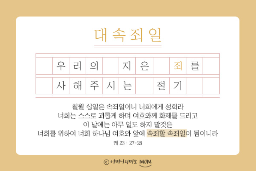 성경에는 하나님께서 지키라고 명하신 절기가 있습니다. 그 중에 연간 절기로는 유월절, 무교절, 초실절(부활절), 칠칠절(오순절), 나팔절, 대속죄일, 초막절이 있는데, 그 중 대속죄일에 대해서 알아보도록 하겠습니다.