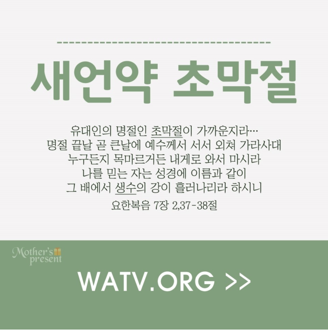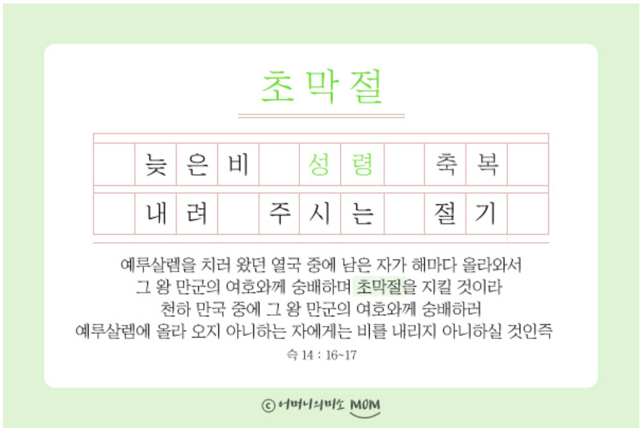 초막절은 성경에서 하나님께서 지키라고 명하신 연간 절기 중에 마지막 절기입니다. 구약성경 스가랴 선지자의 예언을 보면 '초막절을 지키지 않는 사람에게 재앙을 내린다'는 경고의 말씀이 있기 때문에 그 누구도 예외없이 초막절에 대해서 반드시 알아보고 지켜야만 합니다.