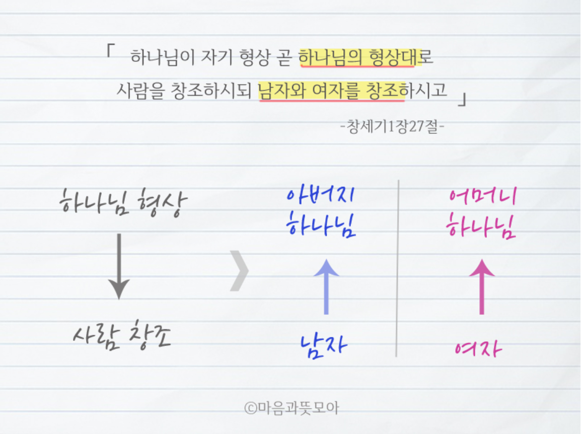 남성적 형상의 하나님을 아버지 하나님으로 부른다면 여성적 형상의 하나님은 누구라고 불러야 하겠습니까? 당연히 어머니 하나님이라고 불러야 하지 않겠습니까! 아버지 하나님의 존재를 기록한 성경은 어머니 하나님의 존재도 동일하게 증거하고 있습니다.
