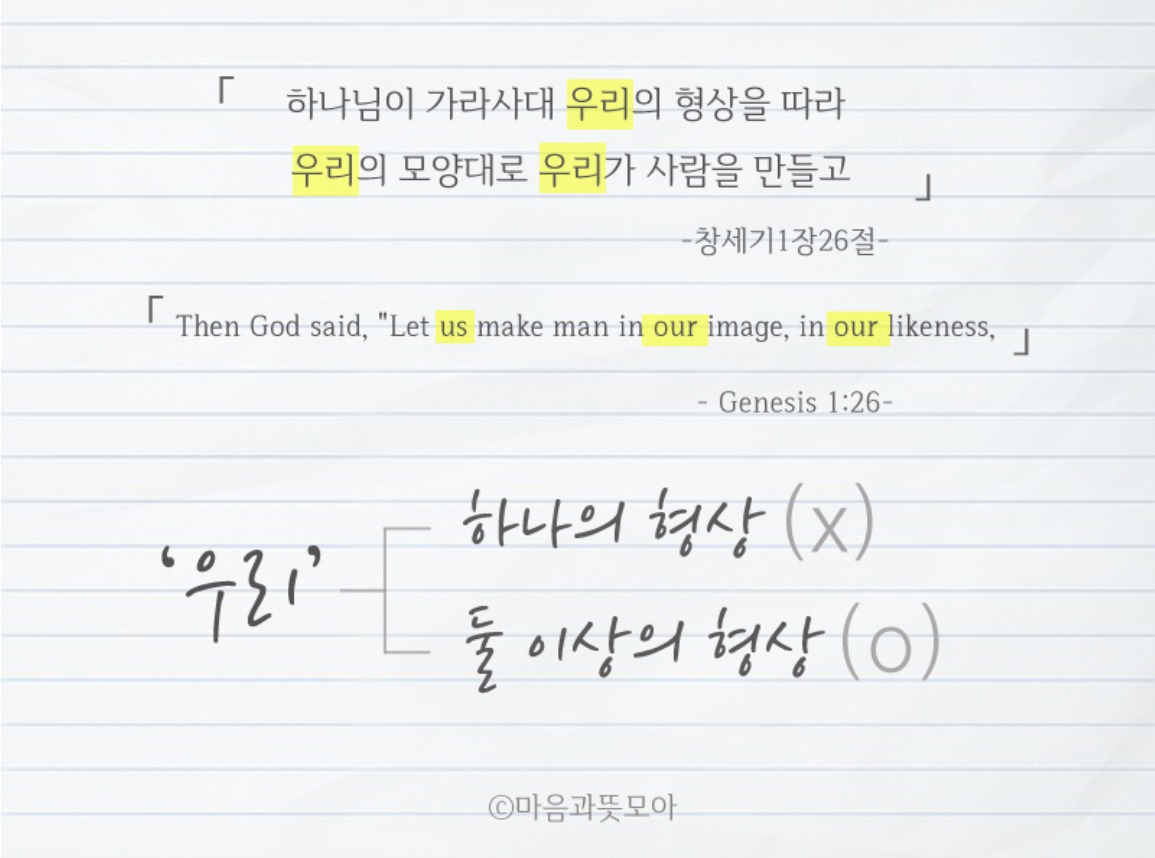 창세기 1장 26절의 이 말씀 속에는 엄청난 비밀이 담겨져 있습니다. 하나님께서는 당신을 가리켜서 '나'라는 단수가 아닌 '우리'라는 복수를 사용하셨습니다. 동아출판사에서 발간한 [성서 속의 불가사의]라는 책에는 [이 대목은 오랫동안 성서를 해석하는 사람들에게 수수께끼가 되어왔습니다.]라고 기록되어 있습니다. 수수께기와 같은 '우리'라는 단어를 하나님께서는 왜 사용하셨을까요? 여기에 대한 해답은 이어지는 27절에서 이미 다 알려주셨습니다.