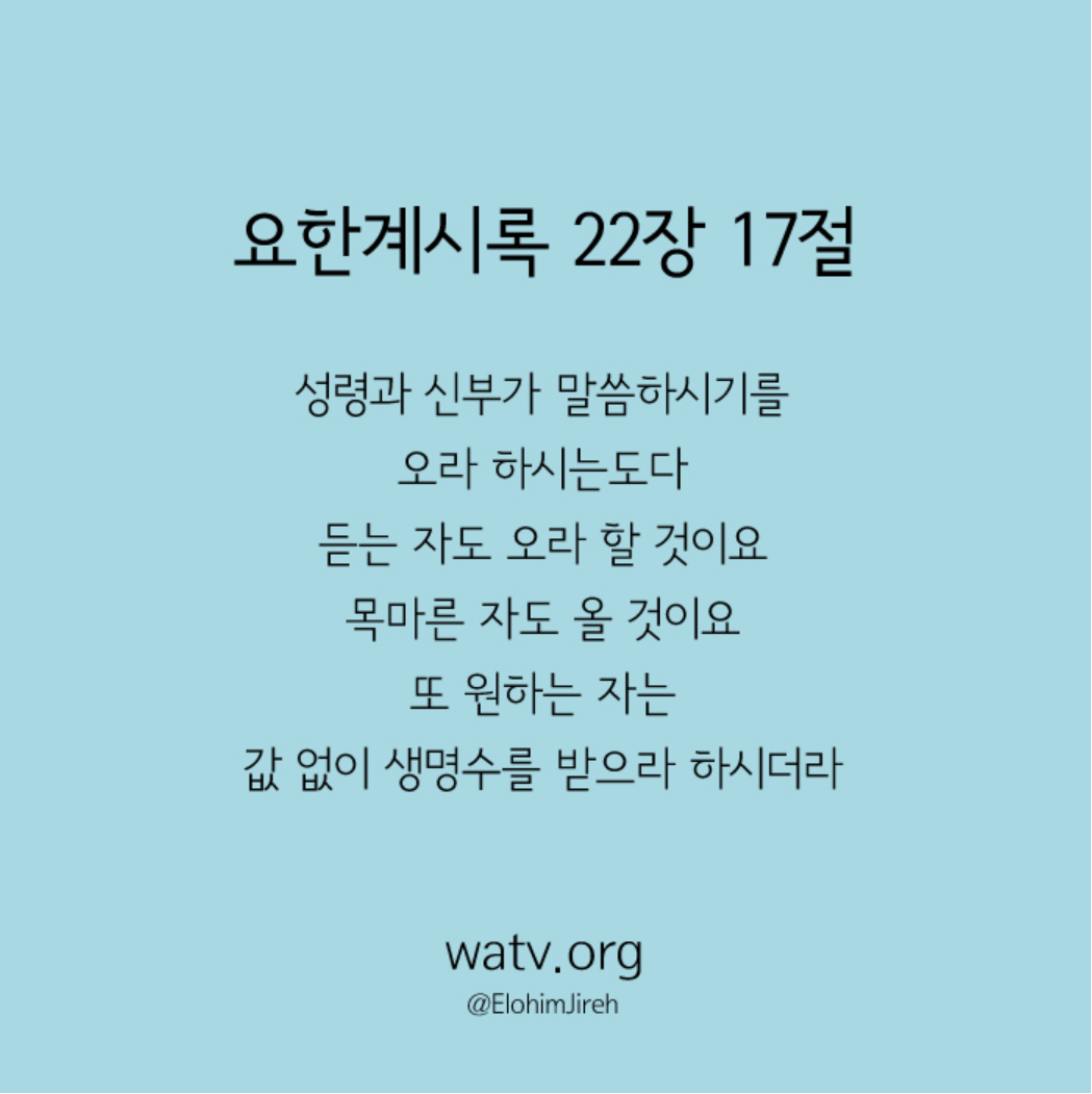 이 시대에 생명수를 받기 위해서는 반드시 신부이신 하늘 예루살렘이 누구이신지 알아야만 합니다. 그 분이 우리 어머니 하나님이십니다.