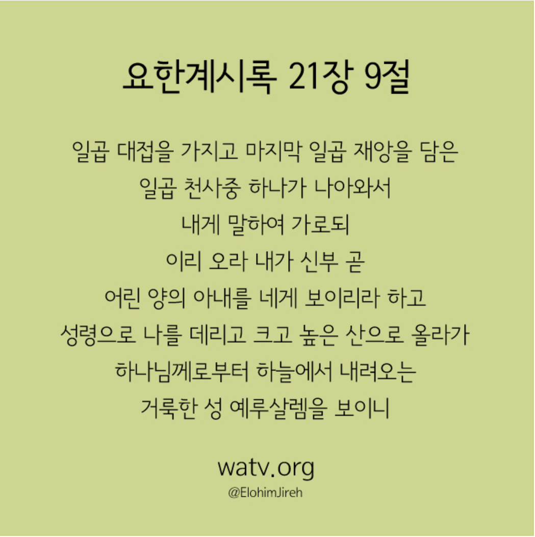 마지막 시대에 생명수를 주시는 분이 누구라고 증거하고 있습니까? '성령과 신부'입니다. 성령은 삼위일체의 아버지 하나님이라는 사실은 대다수의 기독교인들이 인정하는 바입니다. 그런데 성령과 함께 생명수를 주시는 '신부'는 누구이실까요? 하나님께서는 사도 요한에게 이 신부에 대해서 계시로 보여주시길 어린양의 아내요, 하늘에서 내려오는 거룩한 성 예루살렘이라고 하셨습니다.
