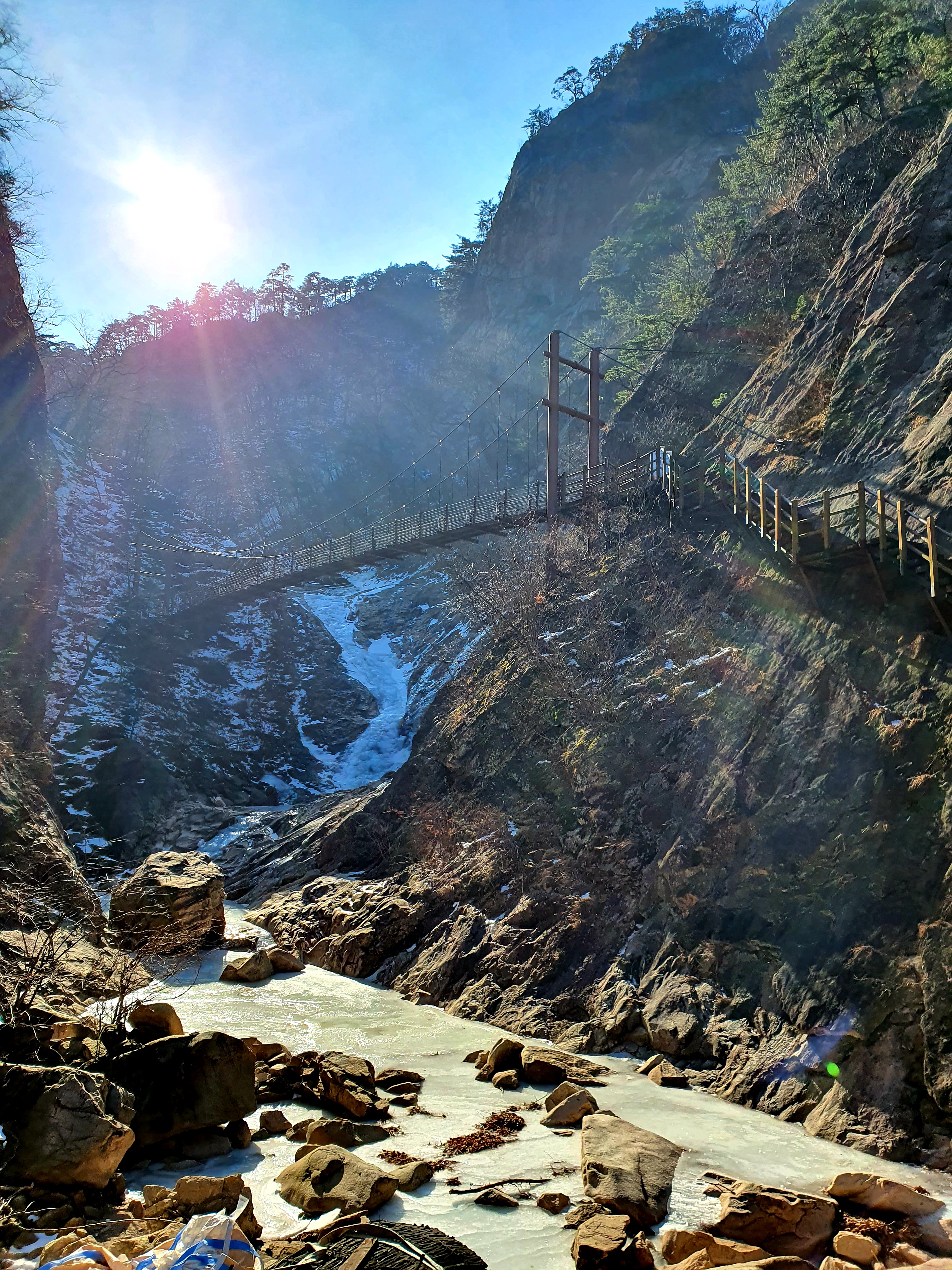 용담폭포 위로 보이는 다리는 출렁다리여요.