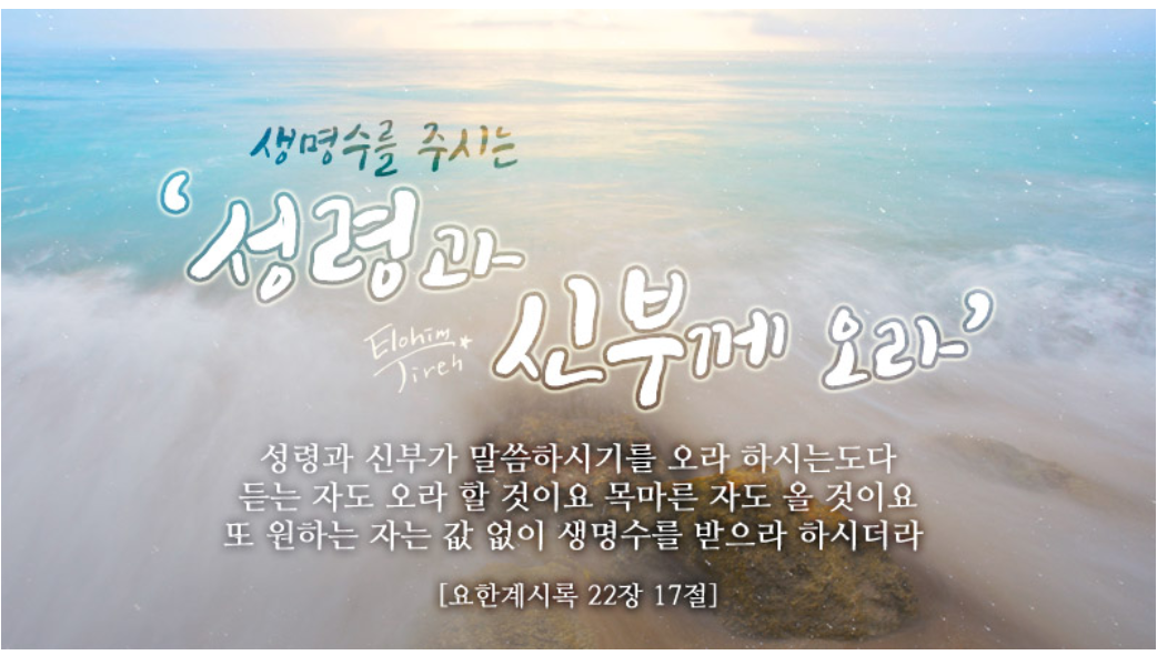 이처럼 성령과 신부께서 '원하는 자들은 값없이 생명수를 받으라'고 부르고 계십니다. 생명수 즉 영생은 새언약 유월절을 통해서 주어집니다. 하나님께서 값없이 베푸시는 이 큰 선물을 소중한 이들에게 나누고 싶은 것은 너무도 당연한 일입니다.