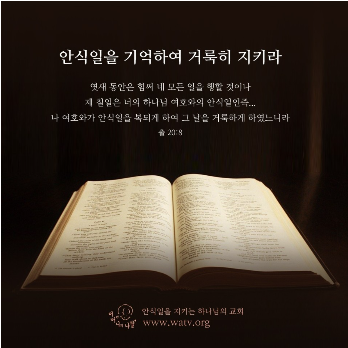 그렇습니다. 우리는 월요일부터 출근하고 월요일부터 학교에 가기 시작하니 습관적으로 한 주의 시작이 월욜일이라는 착각 속에 살아왔었습니다. 한 주의 시작이 일요일이냐 월요일이냐가 뭐가 그리 중요하냐고요? 이 하루 차이로 인해서 하나님의 백성인지 아닌지 운명이 바뀐다면 어떻게 하시겠습니까? 정확하게 알아야 하지 않겠습니까?