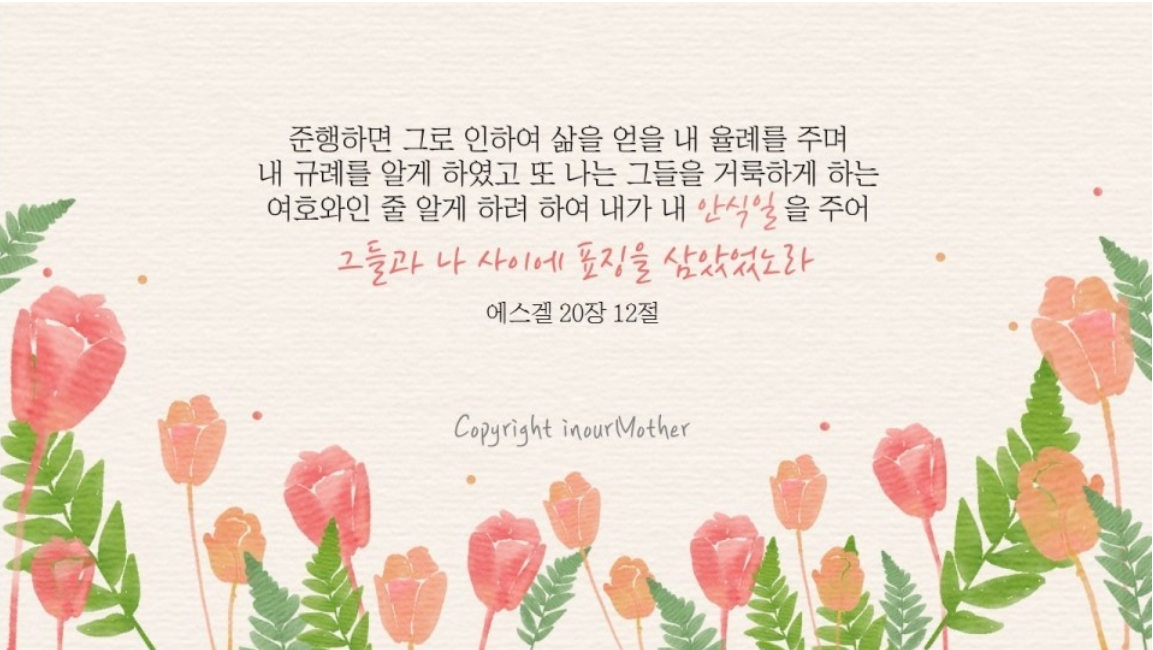 하나님께서 우리에게 규례를 주신 이유는 '삶을 얻게 하기 위함'인데 삶을 얻을 규례중 하나가 이 안식일입니다. 달리 표현하면 안식일을 지키지 않으면 삶을 얻을 수가 없습니다. 즉 구원을 받을 수가 없습니다. 이어서 안식일은 하나님과 하나님 백성 사이의 '표징'이라고 하셨습니다. 즉 안식일을 지키는 자라야 하나님의 백성으로 인정하시겠다는 것입니다. 하나님의 교회가 토요일날 예배를 드리는 이유가 바로 여기에 있습니다.