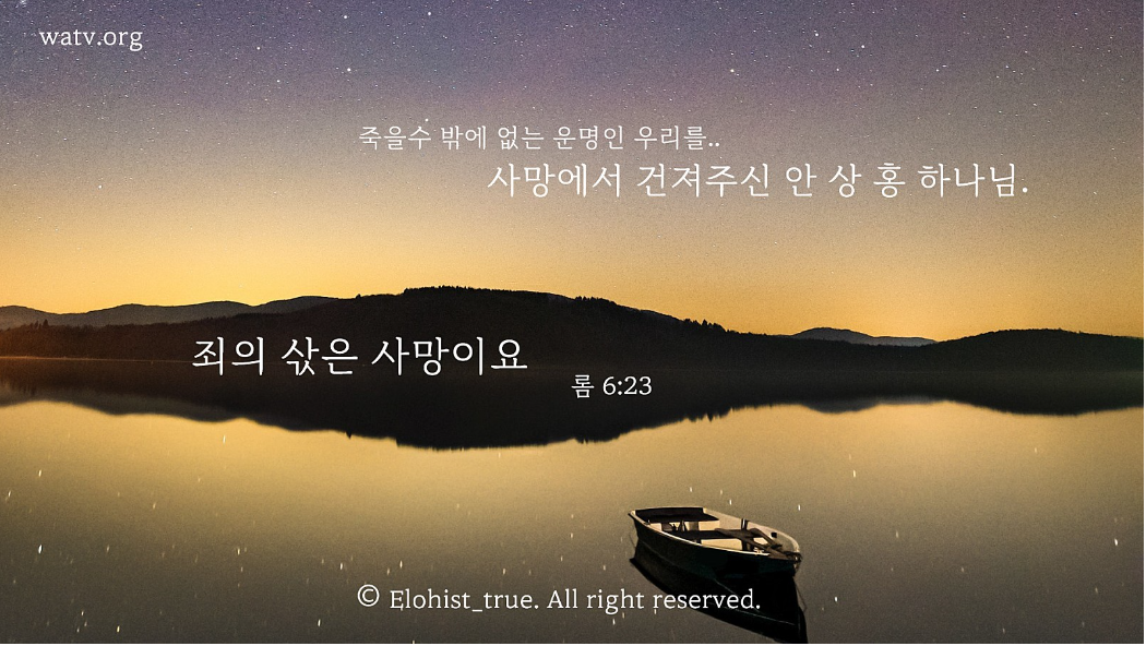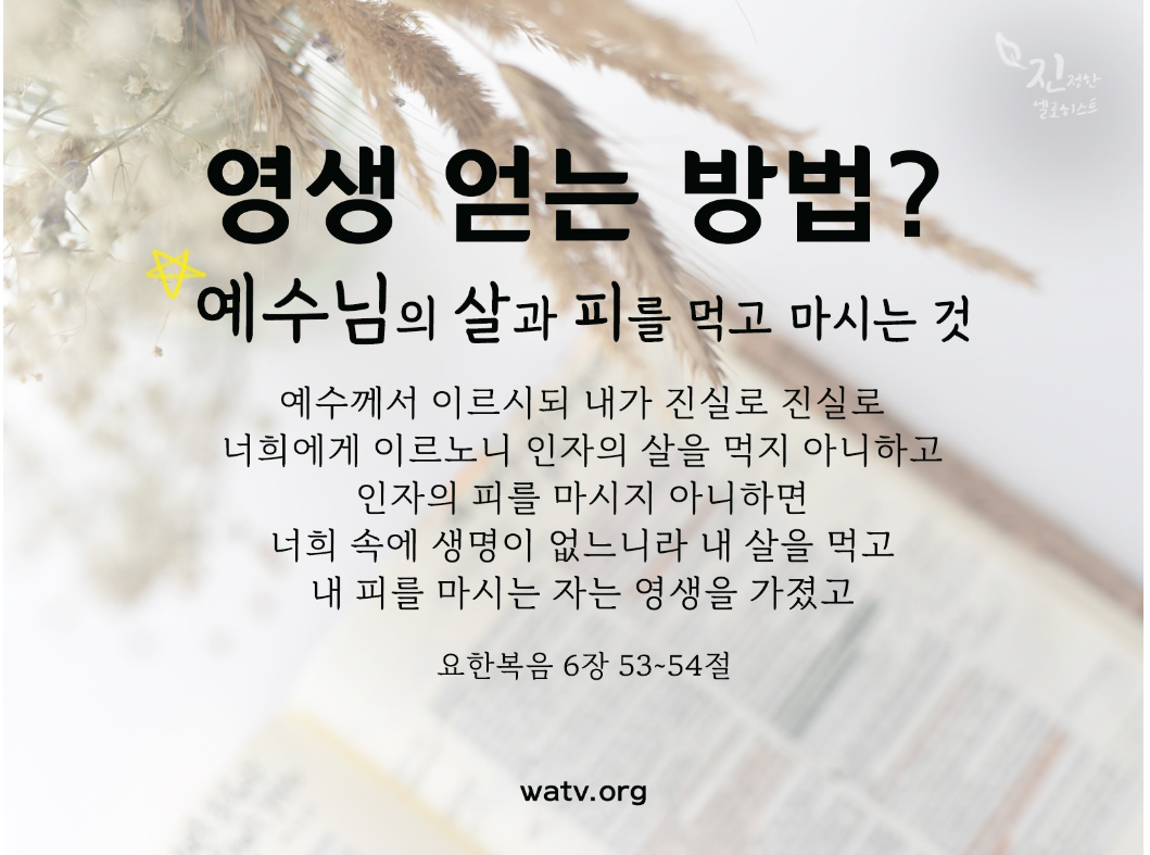 '사망'은 누구나 두려워하고 생각도 하기 싫은 것입니다. 이런 사망을 없애주시고 영생을 주신다는 약속이 새언약 유월절 안에 있는데 그래도 외면하시겠습니까? 하나님께서는 인류가 감당치 못할 방법으로 영생을 주시는 것이 아닙니다. 남녀노소할 것 없이 누구나 쉽게 지킬 수 있는 방법으로 죄사함과 영생을 주신다고 약속하셨는데 이 보다 더 감사하고 기쁜 일이 또 어디에 있겠습니까?