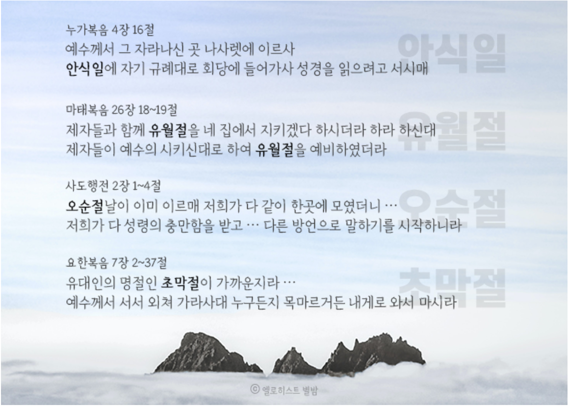 이천 년 전 이 땅에 오신 예수님께서는 친히 하나님의 법 즉 하나님의 계명을 지키시는 본을 보여주셨습니다. 그 예로 안식일, 유월절, 오순절, 초막절 등이 있습니다.