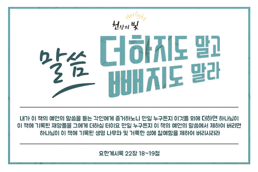 하나님께서는 성경을 마감하시기 전에 하나님 말씀에서 단 하나라도 더하지도 빼지도 말라고 당부하셨습니다. 그러므로 우리는 성경 말씀을 가감하지 않고 그대로 순종해야만이 구원에 이를 수 있습니다.