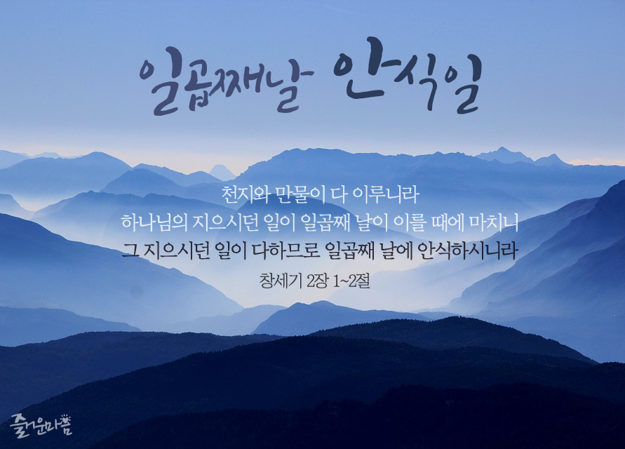하나님께서는 엿새동안 천지만물을 창조하시고 일곱째날에 안식하셨습니다. 그리고 이 날을 복 주사 거룩하게 하셨습니다. 이 일곱째날 안식일을 모세 시대에 와서는 십계명의 네째 계명으로 제정해 주셨습니다.