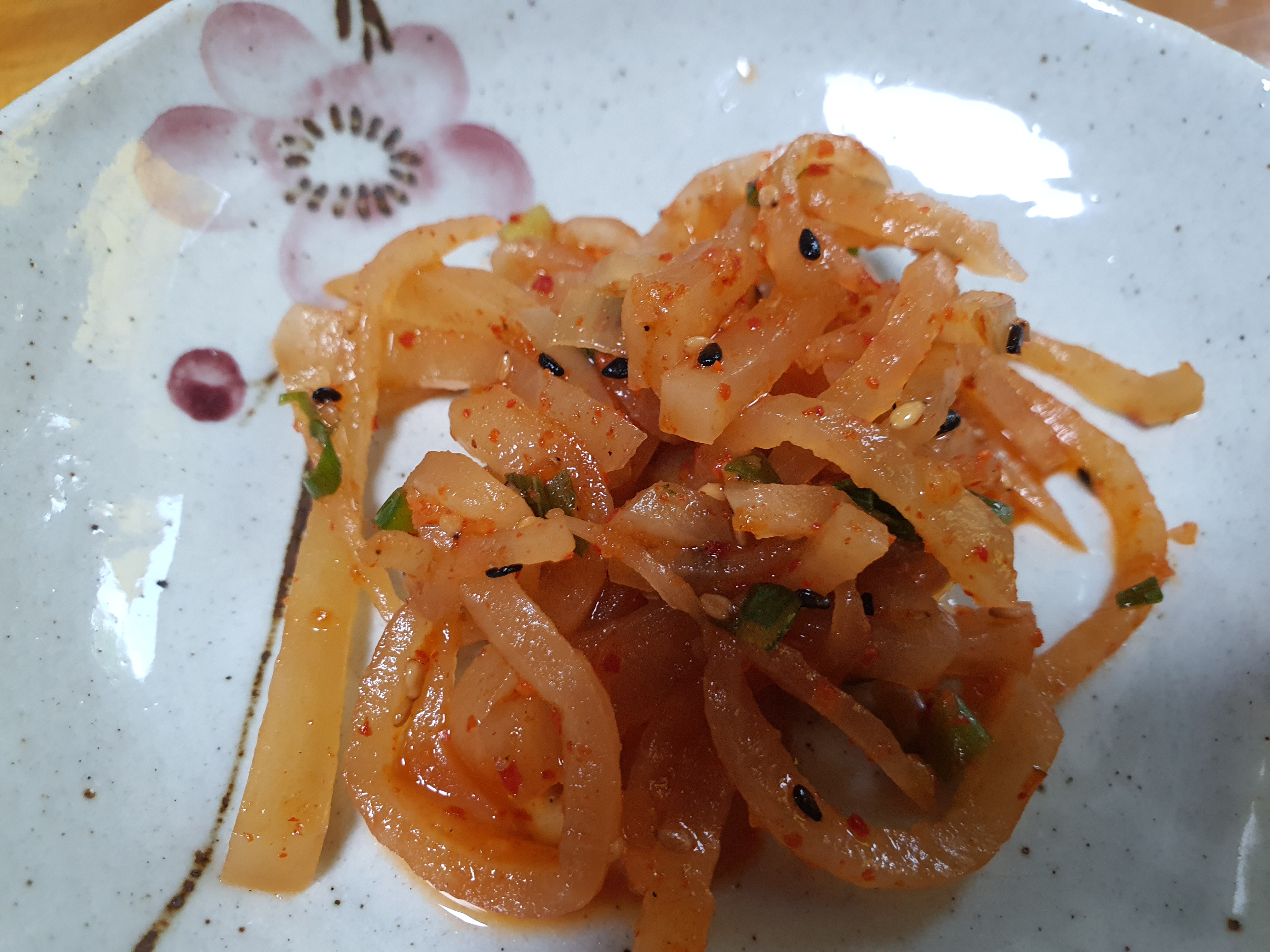 밑반찬은 평범한데 이쁜 도자기 접시에 나와서